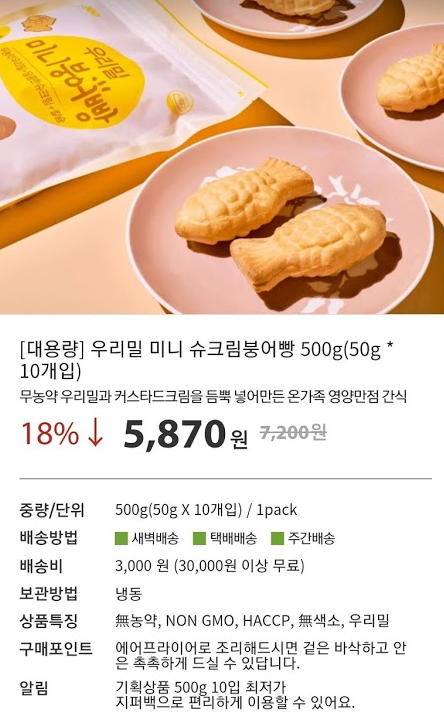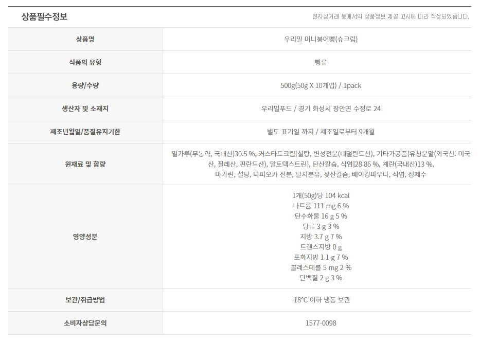 길가에서 파는 일반적인 붕어빵보다 사이즈가 작은 미니붕어빵이다. 냉동이고, 50g 10개로 총 500g이다.