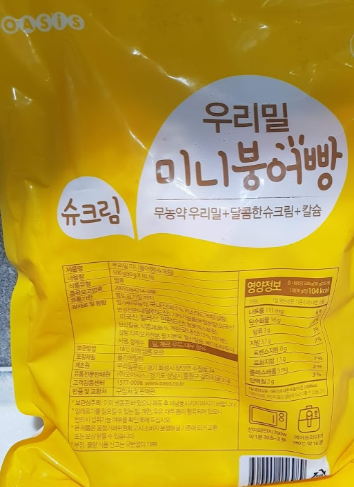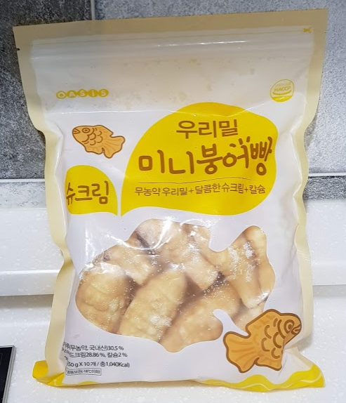 겨울이면 생각나는 간식이 있다. 호떡, 어묵국물, 군고구마, 찐빵, 붕어빵~ 그 중에서도 우리 아이들이 제일 좋아하는 것은 붕어빵이다. 요즘 코로나 때문에 집밖을 나가지 않고 있다. 마트도 가지 않고 오아시스에서 주문해서 먹는다. 오아시스에는 우리 가족이 제일 좋아하는 간식인 붕어빵을 판다. 인터넷 쇼핑몰에서도 파는 것을 봤지만 오아시스는 특별히 무농약 우리밀로 만들었다. 팥과 슈크림 두 가지 있고, 지금껏 팥만 샀었는데 이번에 처음으로 슈크림을 샀다. 팥을 너무나 좋아하는 나에게 팥을 포기하기란 쉽지 않았지만 슈크림도 한번 먹어본다는 생각에 주문했다.