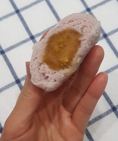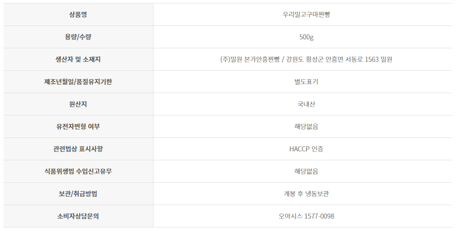 오아시스에는 네가지 종류의 찐빵이 있다. 고구마, 단호박, 우리쌀, 흑미가 있는데 고구마만 특이하게 속에 팥이 아닌 고구마가 들어있다. 고구마 외 세가지의 찐빵 속에는 팥이 들어있다. 팥을 너무나 좋아하여 항상 팥이 든 것만 샀지만 이번에는 고구마를 선택했다. 고구마 찐빵의 겉은 예쁜 핑크색이고 속은 노랑색이다. 고구마 또한 국내산이다.