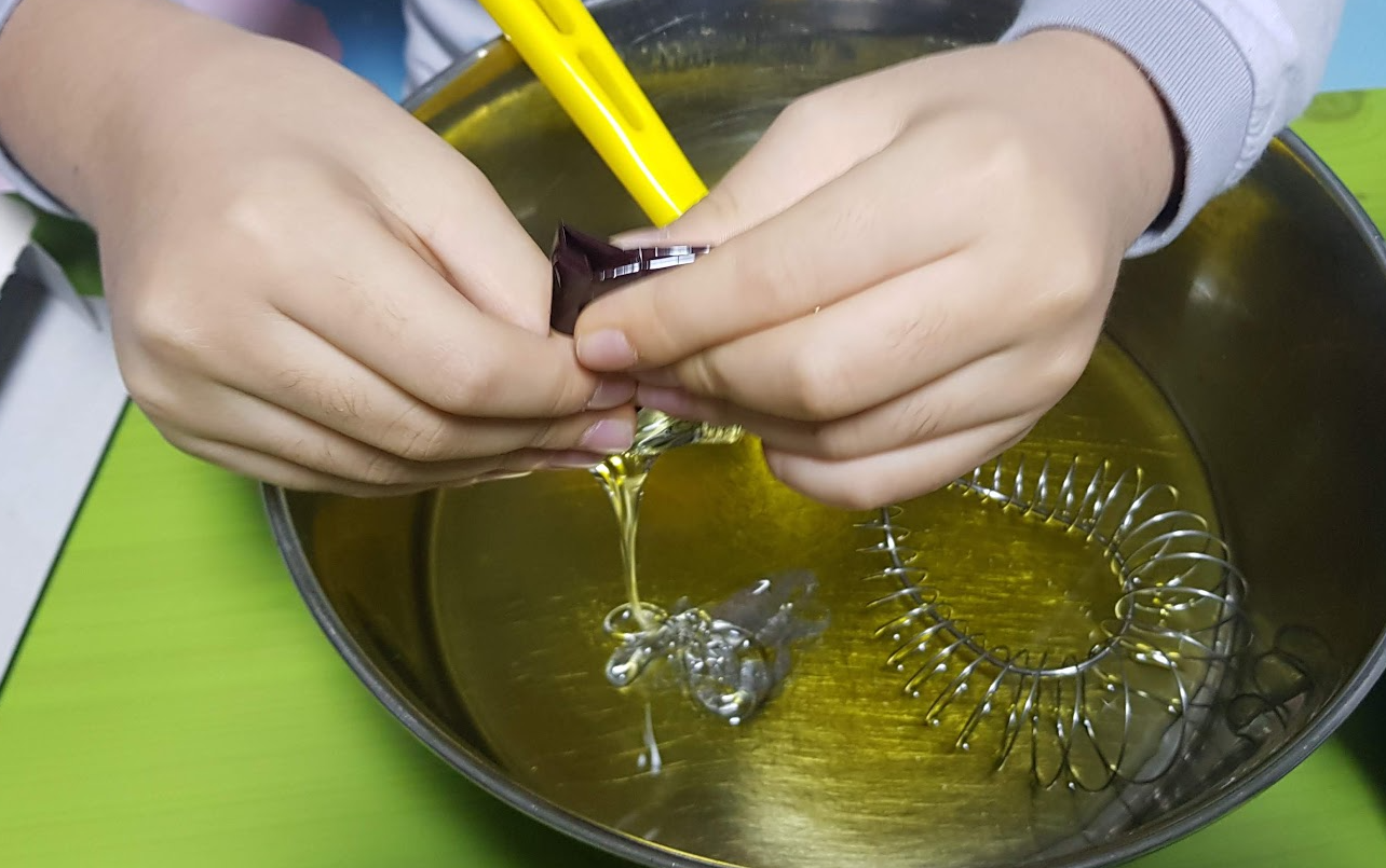 : 둥근 반죽 그릇에 버터 70g을 넣고 거품기로 부드럽게 풀어준 뒤, 올리고물엿 1봉, 계란 반개를 넣고 약 1분간 잘 저어주세요.