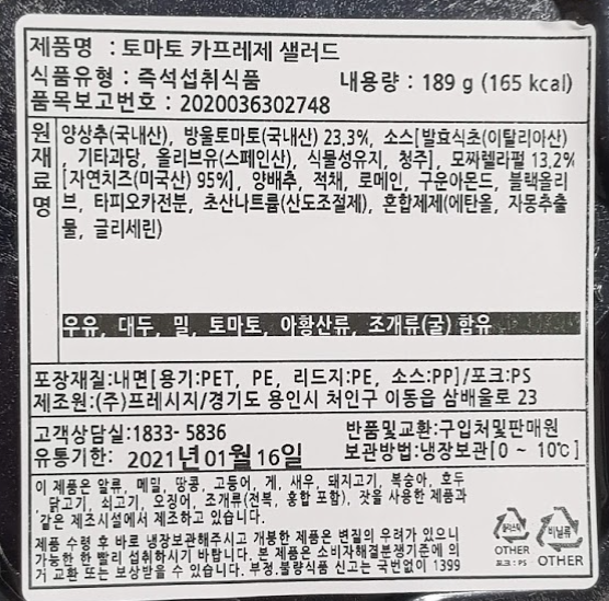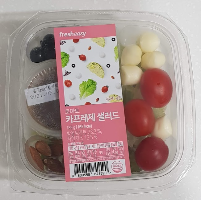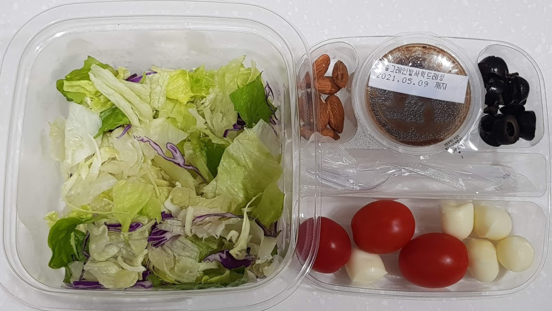 양상추, 양배추 등의 야채와 방울토마토, 블랙올리브, 구운아몬드, 모짜렐라 등으로 구성되어 있고, 소스와 작은 포크 하나가 들어있다. 일회용 포크는 굳이 없어도 될 것 같다.