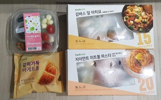 프레시지의 스테이크와 빠네 파스타를 맛있게 먹은 후 다른 상품을 또 주문했다. 여러가지를 주문했는데 오늘은 빵이 너무 먹고 싶어 갈릭가득 바게트볼과 하나만 먹기 아쉬워 토마토 카프레제 샐러드를 먼저 먹어 보았다. 다른 것도 모두 먹고 싶었지만 남편이 재택 근무를 하지 않고, 출근을 하는 바람에 내일로 미뤘다.