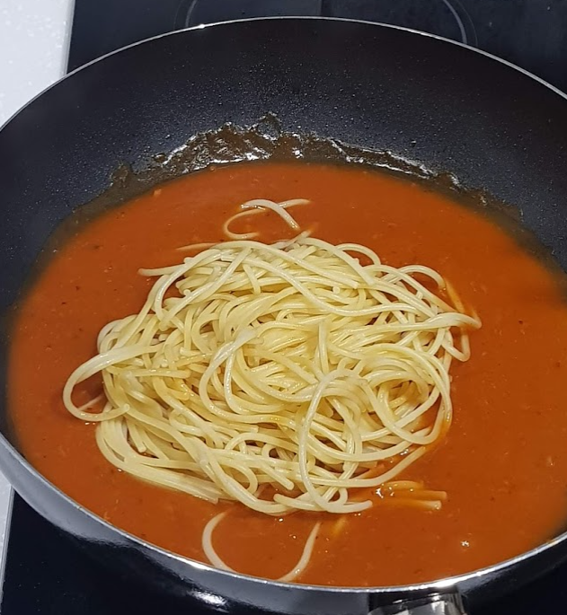 ㆍ팬에 소스와 면수 150ml(종이컵 1컵)를 넣고 중불에서 3분간 졸여 주기