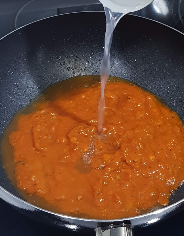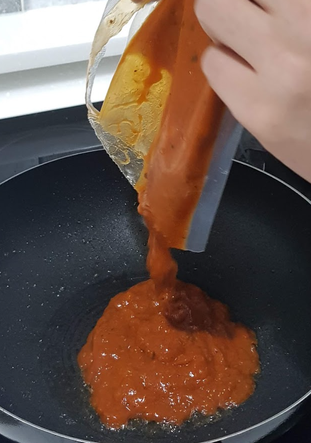 ㆍ팬에 소스와 면수 150ml(종이컵 1컵)를 넣고 중불에서 3분간 졸여 주기