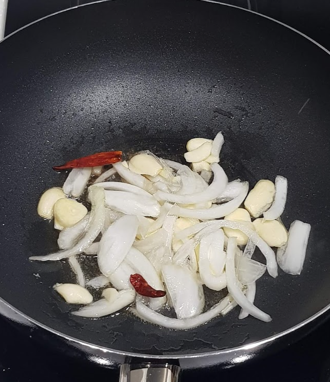 ㆍ팬에 올리브오일을 두른 뒤, 마늘, 양파, 베트남고추를 넣어 중불에서 1분간 볶기