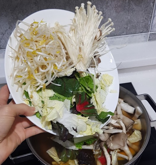 ㆍ샤브 육수에 모든 야채와 버섯을 넣고 끓이기