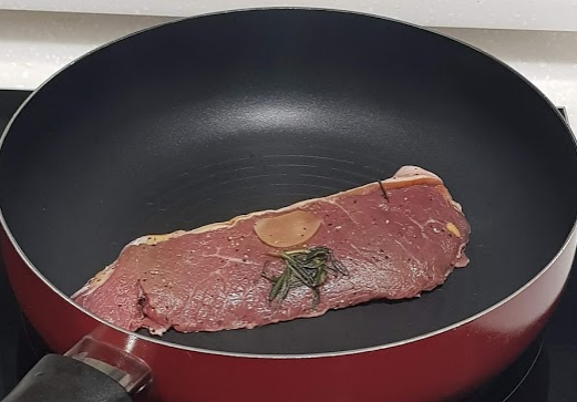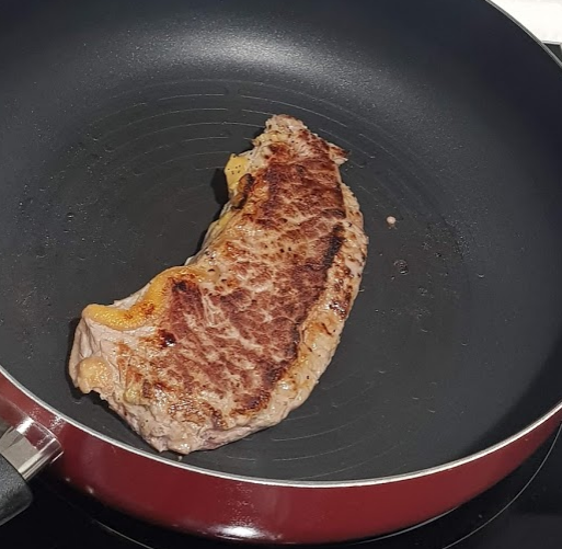 - 팬에 강불로 가열하여 연기가 나기 시작하면 채끝등심 스테이크를 1분간 구워준 후 뒤집어 줍니다.