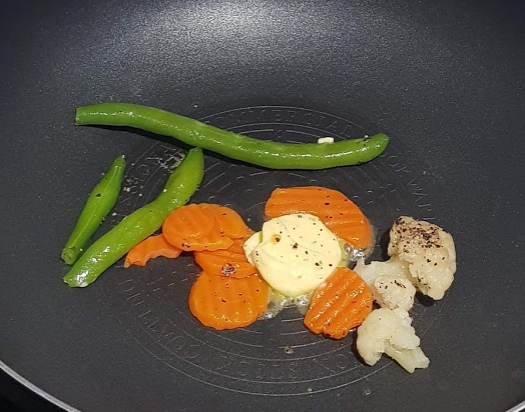 - 프라이팬에 믹스 야채와 버터를 넣고 강불에서 센 불로 1분간 볶아줍니다.