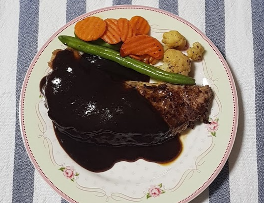 완성 접시에 채끝등심 스테이크와 컬리플라워, 그린빈스, 당근을 담은 후 스테이크 소스를 곁들여 주세요.