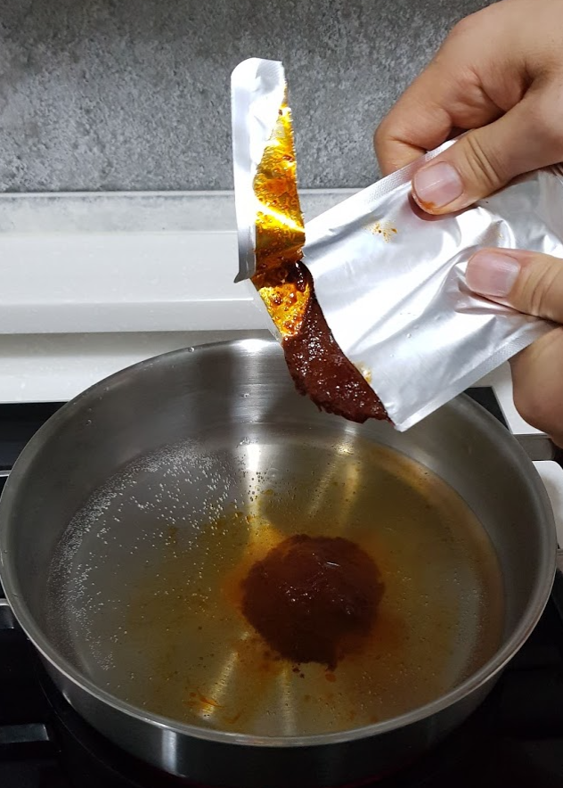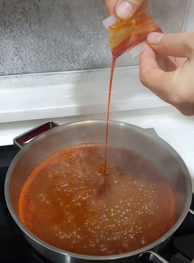 - 지마장 소스를 제외한 모든 재료와 물 400ml(종이컵 2컵 반)를 넣고 강불로 끓이기
