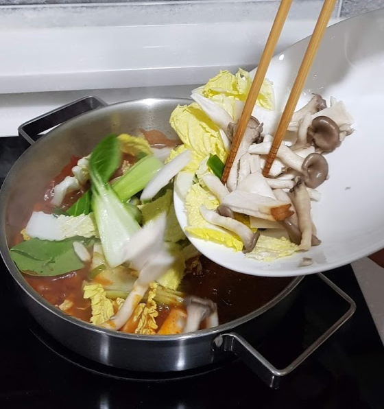 : 소고기, 느타리버섯, 새송이버섯, 흑목이버섯, 청경채, 배추, 대파, 포두부, 당면, 고추기름, 마라탕 소스, 지마장 소스