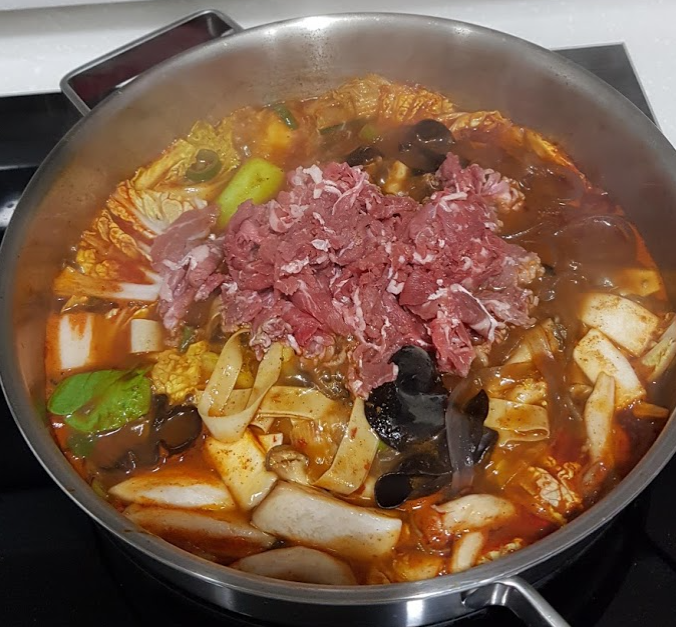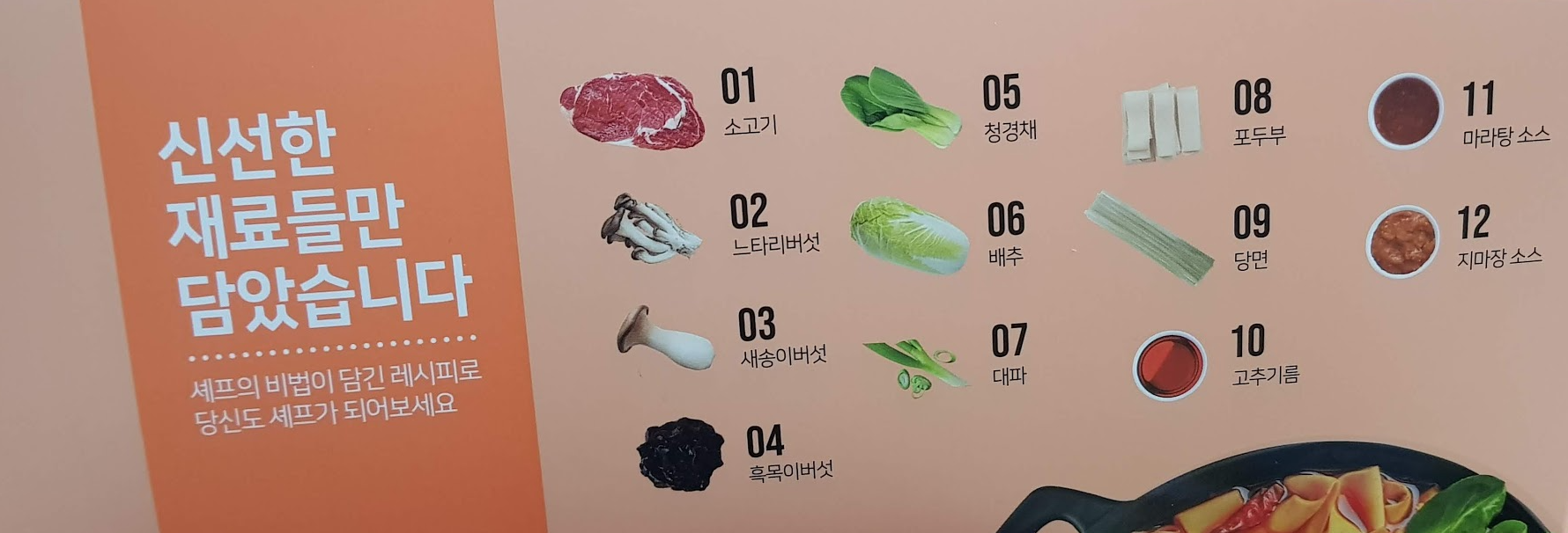 : 소고기, 느타리버섯, 새송이버섯, 흑목이버섯, 청경채, 배추, 대파, 포두부, 당면, 고추기름, 마라탕 소스, 지마장 소스