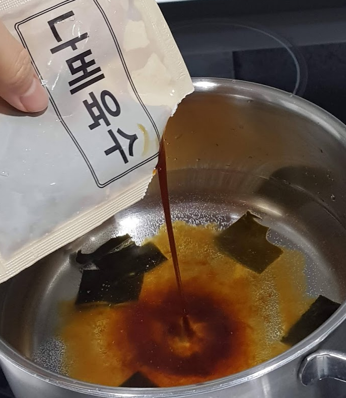 - 육수가 끓으면 다시마를 건지고 불을 끄기