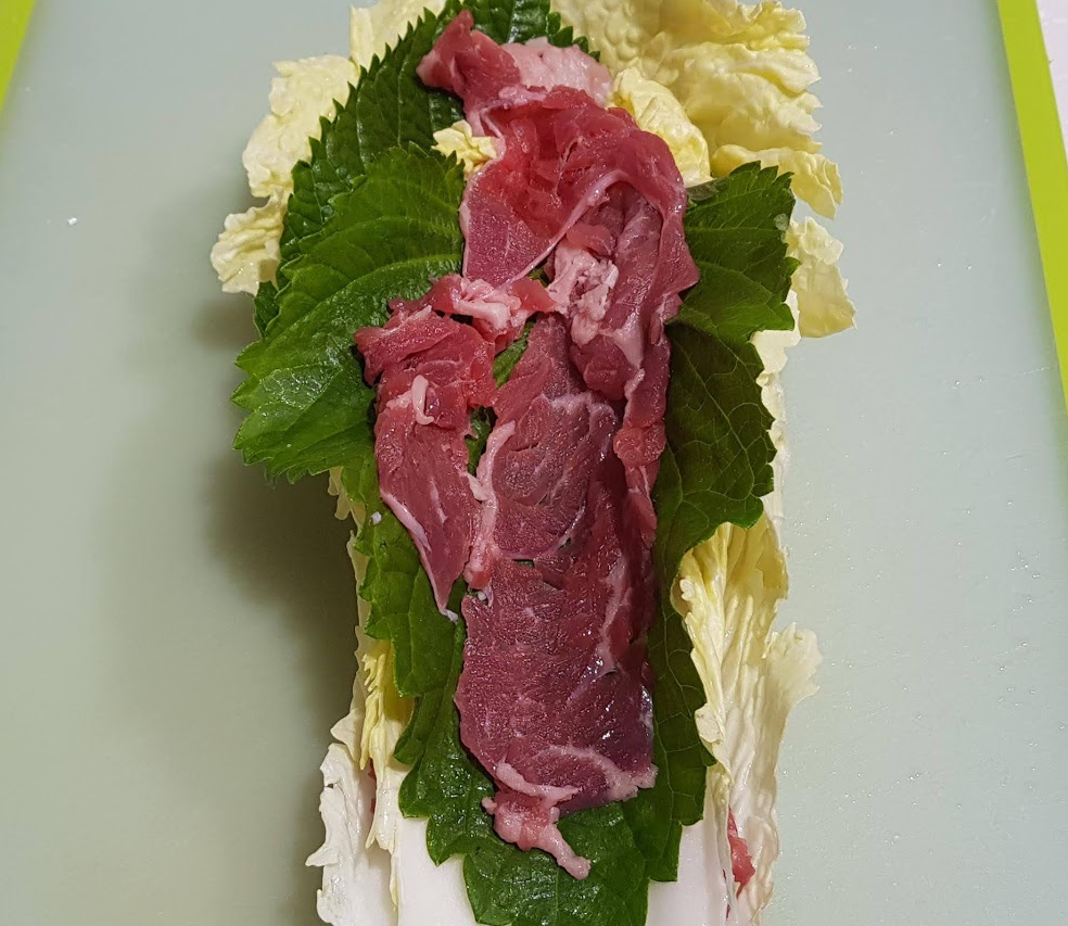 - 도마에 배추 > 깻잎 > 소고기 > 배추 > 깻잎 > 소고기 > 배추 순으로 재료를 쌓기