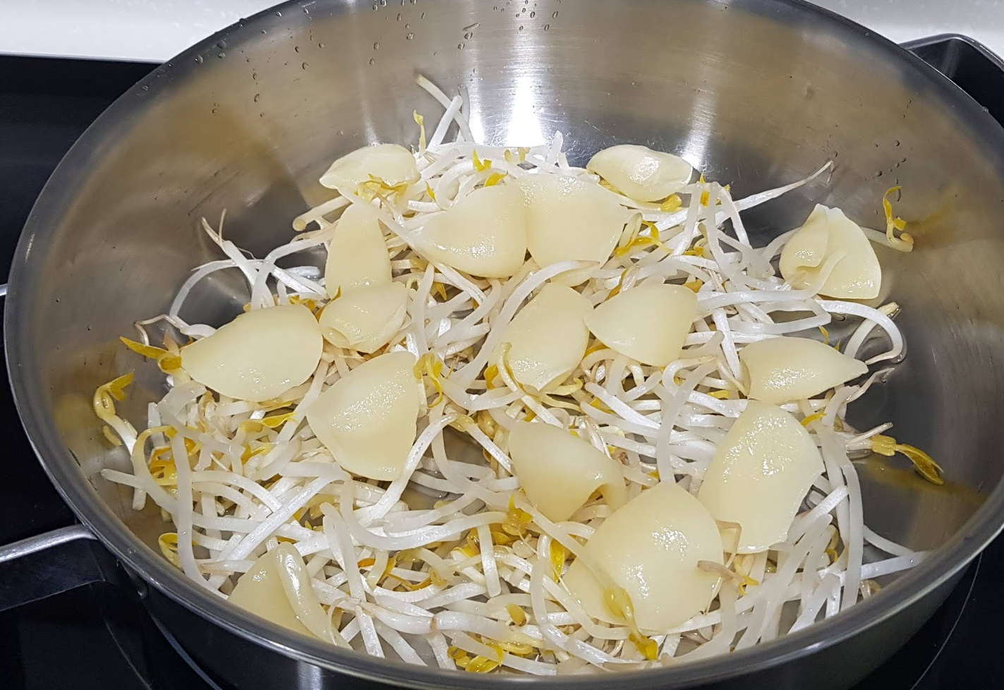 - 전골냄비 바닥에 숙주, 감자 수제비를 깔기