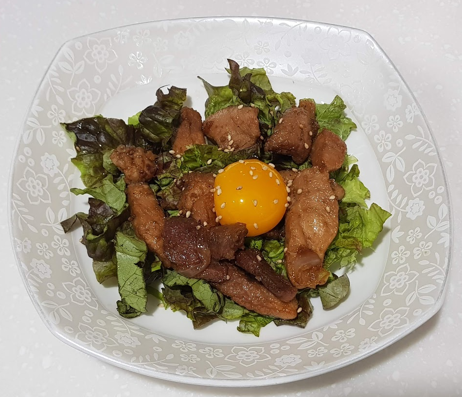 6. 그릇에 밥, 야채, 고기 순으로 담고 계란노른자(혹은 계란프라이)를 넣고, 통깨를 뿌린다.