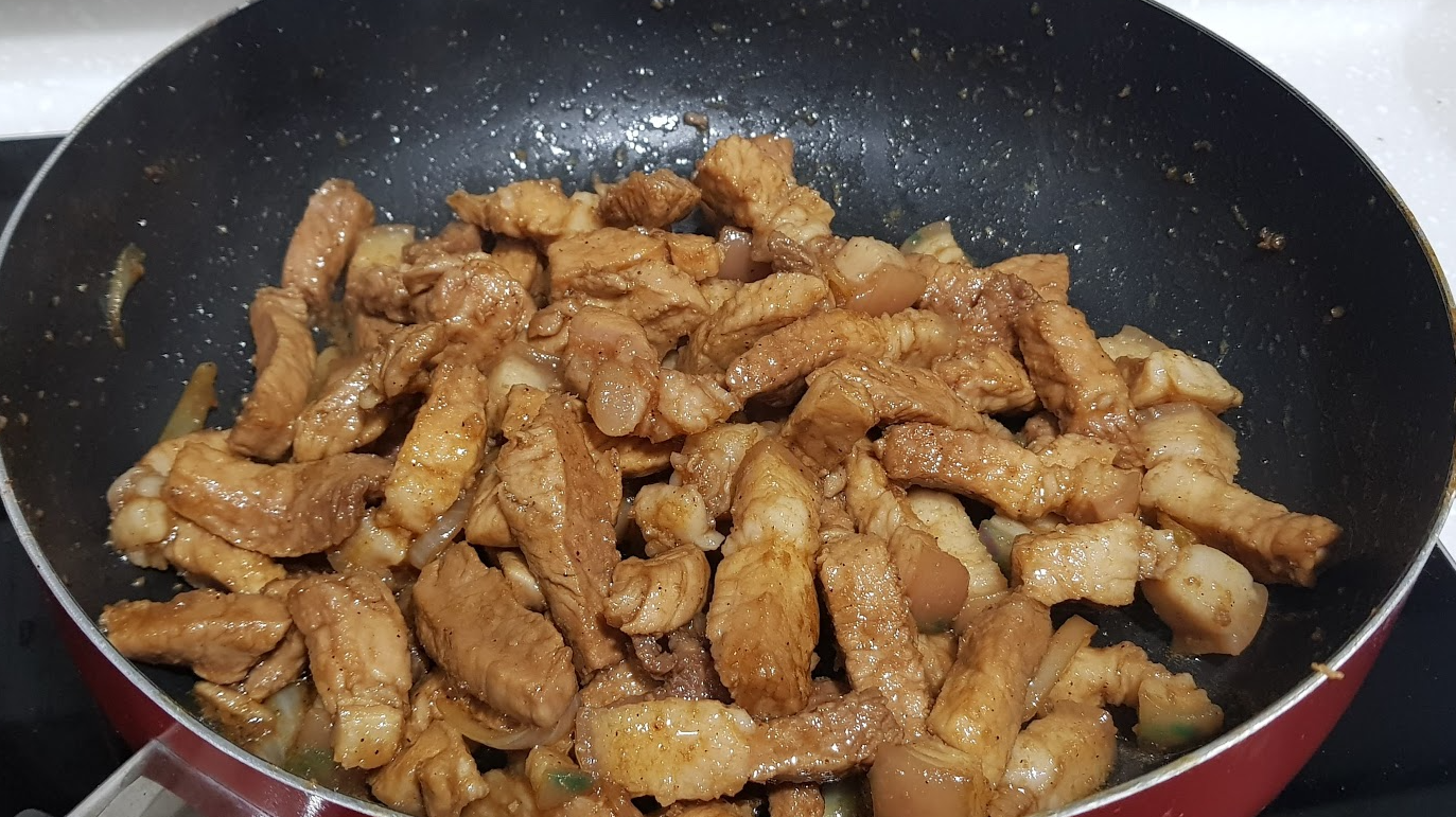 4. 돼지고기와 양파, 양념장을 넣고 졸여 준다.